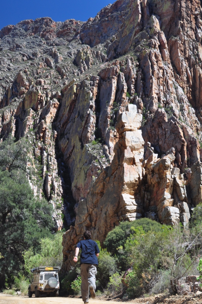 The following morning we were off, surrounded by other Land Rovers, heading into the wilderness of the Small Karoo, where Die Hel is situated. After a 4 hour drive on dirt roads, crossing umpteem rivers with water flowing over the bonnet, we found ourselves on a clifftop road, looking down into The Hel. Surrounded by hills on all sides, this tiny place gained its name simply due to the difficulty in getting there and getting out. With the Landy parked within feet of a 1000m drop we thought what better time to stop, pop the champagne and take some photos.
